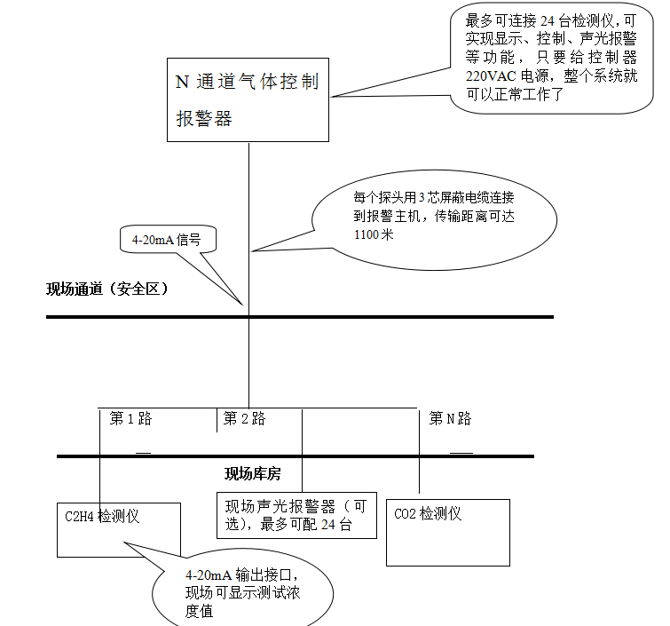 現(xiàn)場 C2H4和CO2變送器傳過來的4-20mA信號全部連接到N通道氣體控制報警器上,當某一路C2H4和CO2檢測儀發(fā)出報警信號時(同時有繼電器輸出,可觸發(fā)風機或乙醇產(chǎn)生機開關(guān)),提供給監(jiān)控人員分級的聲光報警,如果有需要,可以將監(jiān)控主機通過網(wǎng)絡將數(shù)據(jù)傳輸?shù)狡渌O(jiān)控中心。在現(xiàn)場可以實時顯示C2H4和CO2的濃度,也可以在每一個探頭附近裝一個聲光報警器,當現(xiàn)場發(fā)生報警時可以通知人員快速處理或撤離。
